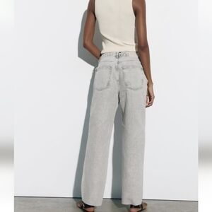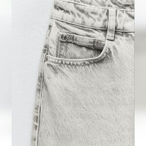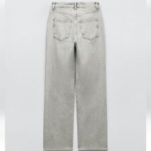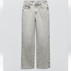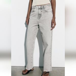High-waisted five pocket jeans. Washed effect. Straight leg and unfinished hem. Front zip and metal button closure.