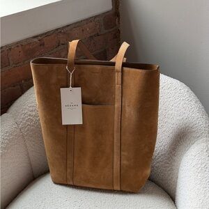 Elegant suede tote bag. Features sturdy handles. Perfect for everyday use.