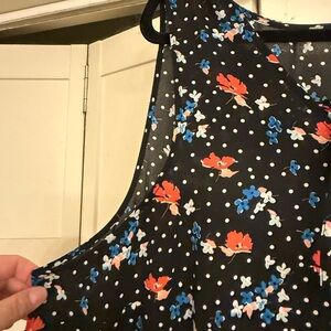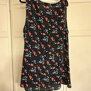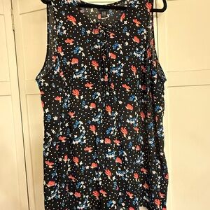 Chic black blouse with vibrant floral design. Features red and blue accents. Sleeveless and stylish. Lace up detail that can be tied or left open