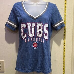 Blue V-neck T-shirt with Cubs Baseball logo. Features gray and white stripes on sleeves.