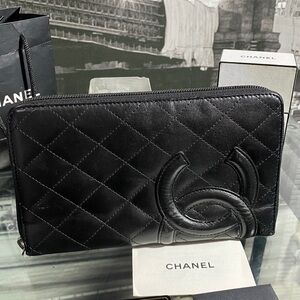 Authentic CHANEL Lambskin Cambon Line Zippy Clutch Wallet in preowned condition Authenticity card included. Signs of wear including some color restoration imperfections maybe noted. Pulley included unattached. Perfect for everyday use. Very spacious inside Will fit your cell phone, keys and accessories.