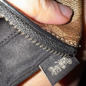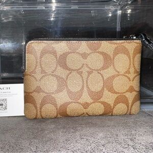 The Coach Corner Zip Wristlet in Signature Canvas features a brown canvas and leather material with a horse and carriage design, perfect for Halloween or equestrian enthusiasts. This small pouch wallet includes credit card slots and a zipper for secure storage. The wristlet style and strap accent make it a convenient and stylish accessory for any woman's wardrobe.
