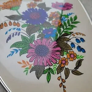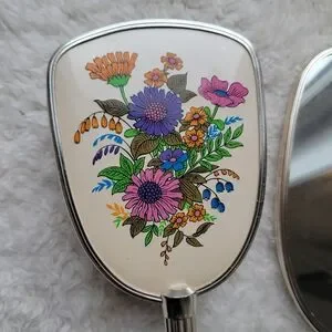 Elegant hand mirror and brush set with floral design. Features silver handles and colorful floral pattern.