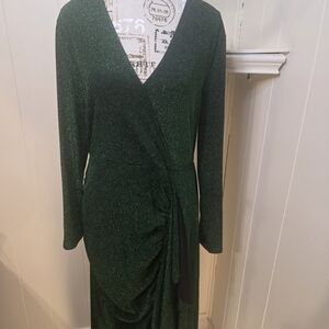 Chic dark green dress with a wrap style. Long sleeves and shimmering fabric. Perfect for elegant occasions.