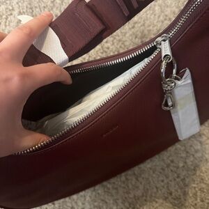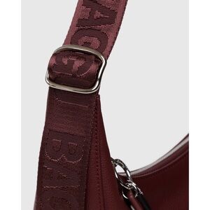 Medium crescent shape in recycled leather. Elevated, durable, and roomy. With an interior zip pocket and thoughtful additions like a key leash and debossed keychain.