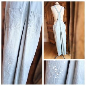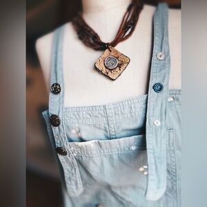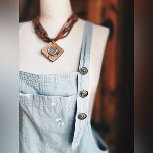 This one-of-a-kind (OOAK) piece is a masterclass in the Boho-Chic Revival. Crafted from premium, light weight sage green cotton twill (not denim), these overalls offer a soft, breathable drape that is perfect for year-round styling. Gorgeous purposefully faded and distressed sage green overalls with many hand sewn vintage buttons. If you know me . Then you know I collect vintage buttons.purposeful bleach and paint splatters along with purposeful raw hemline . Adjustable straps are adorned with brass tone vintage buttons and each button is back with vintage shell , resin and plastic buttons for double support and unique detailing. Overalls only this listing. Leather Aquarius necklace is available and listed separately. Size L 19” across waist . Drop overall crotch inseam is 25” L