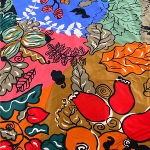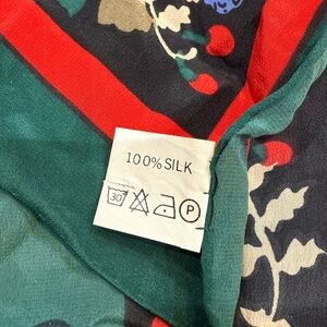 Hand painted and hand rolled. Vibrant silk scarf with a floral pattern. Features red, blue, green, and orange hues. 100% silk. No call outs.