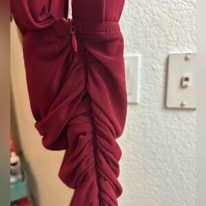 Chic strapless design. Rich burgundy hue. Perfect for evening events.