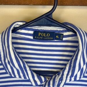 Classic striped polo shirt by Ralph Lauren. Features blue and white stripes. Ideal for casual wear.