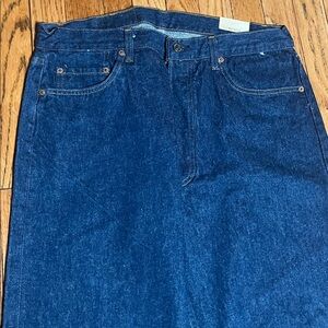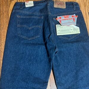 "Rinse" or dark wash denim. Made in the USA vintage, 1980s-90s iterations, these 100% cotton, non-stretch jeans feature the signature button fly, straight leg, and high-rise fit. This is a dark indigo blue color did not photograph well. smoke free environment.Approx measurements waist (122)