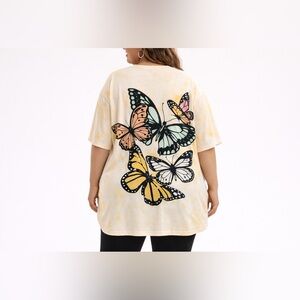 Plus Size 1XL Butterfly Tunic by SHEIN Curve. Relaxed fit oversized tee with bold butterfly graphic print and soft yellow tie-dye wash. Casual comfy style perfect for leggings, biker shorts, or jeans.