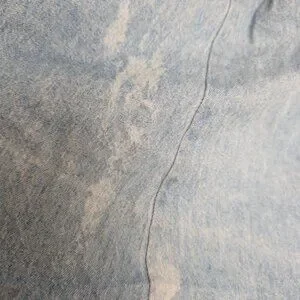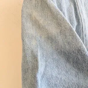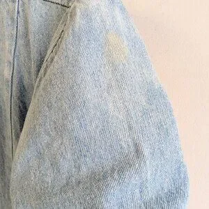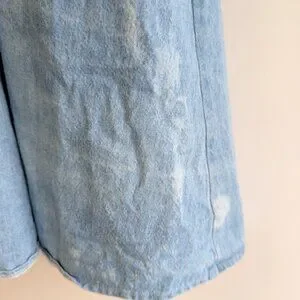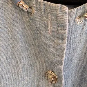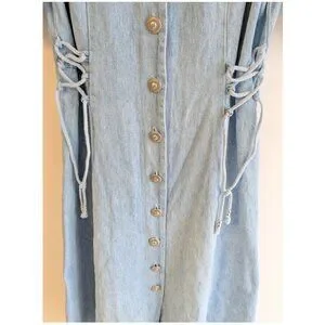 Light colored denim with adjustable ties to lace up the sides, giving a very adjustable and flattering waistline. Silver buttton up front makes it an option to be a long cardigan duster. Short sleeves. Bead cord detail at scoop neckline.