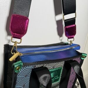The Kurt Geiger Handbag Purse in Rainbow Southbank Ombré is a stylish and colorful top handle bag designed for women. The multicolor exterior, featuring an ombré pattern from pink to purple, adds a vibrant and eye-catching touch to any outfit. Made from sturdy canvas material, this handbag combines practicality with a fashionable design, making it a perfect accessory for any woman on the go. With its trendy brand and unique rainbow theme, this Kurt Geiger handbag is sure to make a statement.
