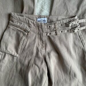 Cream washed, hook & zip closure, side pocket detail, adjustable buckle waist, silver-toned hardware, wide-leg