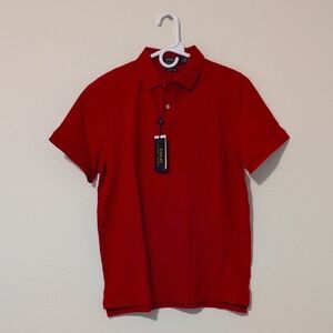 Vibrant red polo with short sleeves. Features buttoned collar. Timeless design by Ralph Lauren.