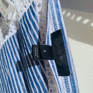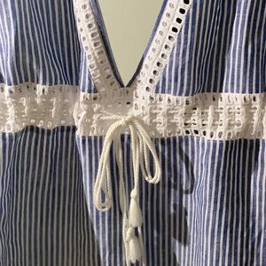 Chic V-neck coverup with blue and white stripes. Features delicate lace trim. Ideal for beach outings.