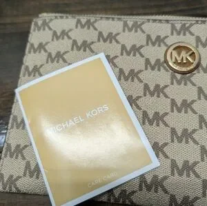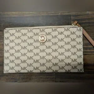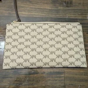 Michael Kors Fulton Large Zip Clutch Wristlet MK Signature Brown Tan