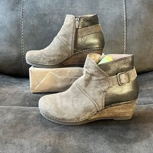 Dansko Leather Suede Ankle Booties Taupe Bronze Wedge Heel Size 40 EUC