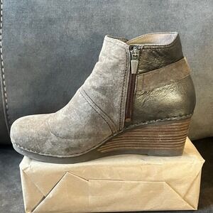 Dansko wedge ankle boots women size 40, taupe bronze leather booties, Dansko suede comfort boots, Dansko women's wedge heel booties, Dansko leather ankle boot zip