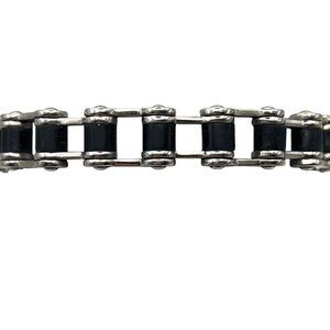 A sleek two-tone stainless steel bracelet featuring an intricate bike chain design with black and silver links, offering a modern and masculine accessory for everyday wear.