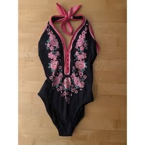 NWT Johnny Was Blum Halter One Piece Swimsuit Black Pink Small