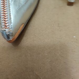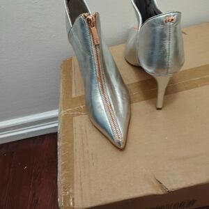 Chic silver boots with a pointed toe. Features a rose gold zipper for added style.