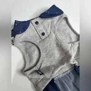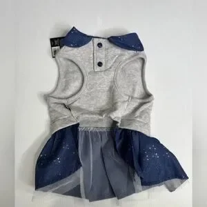 Features a screen-printed graphic, a metallic sparkle print on the collar and skirt, and tulle under the skirt, as well as a leash hole.