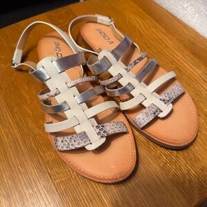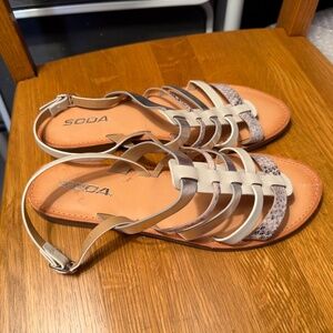 NEW flat sandals made by Soda, women’s size 9. They feature a multi-strap design with a combination of white, silver, and snakeskin-print straps, along with a tan footbed and an adjustable ankle buckle.