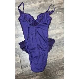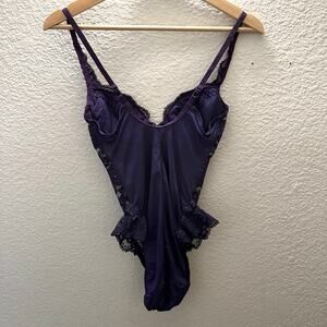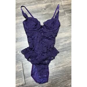 Victoria’s Secret purple lace teddy bodysuit featuring underwire cups, adjustable spaghetti straps, and a feminine stretch lace overlay. Flattering, sculpted silhouette with a snap gusset bottom. Gorgeous plum / eggplant purple tone from Victoria’s Secret’s earlier lingerie era (more structured and detailed than modern VS).