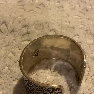 Chic silver bracelet with intricate filigree design. Adds elegance to any outfit.