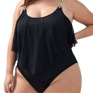 plus size swimsuit, black one piece, sheer overlay swim, gold chain straps, high cut leg, cheeky one piece, resort swimwear, vacation cruise pool beach