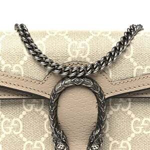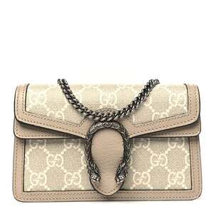Elevate your style with the Gucci GG Supreme Textured Dollar Calfskin Super Mini Dionysus Shoulder Bag in Beige Mystic White Oatmeal. This exquisite bag features the iconic GG Supreme canvas, luxurious calfskin leather, and a striking Dionysus tiger head closure. The compact size makes it perfect for carrying essentials while making a bold fashion statement.