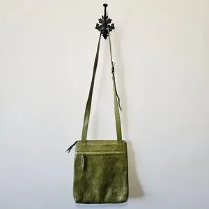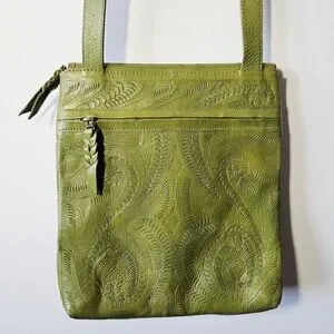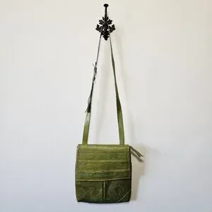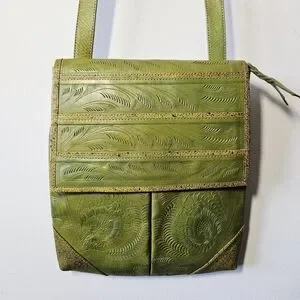 vintage green leather crossbody bag, embossed floral tooled leather purse, boho western shoulder bag, artisan handcrafted satchel, 70s retro style accessory, earthy olive green handbag, folk art inspired leatherwork, unique textured pattern bag, bohemian festival purse, rustic handmade crossbody, botanical embossed detail, vintage southwestern aesthetic, eco chic boho fashion, artistic leather statement bag, timeless earthy accessory