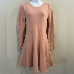 Express mini dress in 41% Rayon, polyester, nylon and spandex. Super soft and looks and feels amazing on. I’d call the color a mixture of Pink and 🍑. It has a fitted bodice with a skater skirt. Comes to about knees depending on your height. I’m 5’7” tall. I only wore it one time and would consider it NWOT. There are no signs at all of wear. It looks great with boots or heals. Size Med or 10.