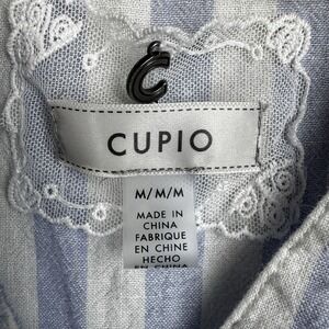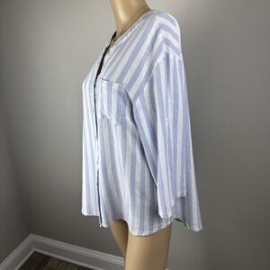Cupio Women's Medium Blue Striped V Neck Button Up Front Pocket Linen Blend Top
