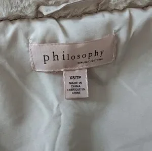 Philosophy faux fur jacket in a soft cream neutral features a plush texture, oversized hood, and zip front closure. The relaxed silhouette and drawstring hood detail give it that elevated off-duty winter look perfect for quiet luxury styling, après ski vibes, or soft girl winter layering.
