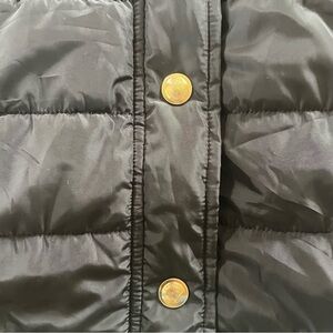 Elegant black puffer vest with gold accents. Ideal for layering. Size Large
