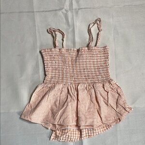 Charming pink gingham smocked top with ruffle hem. Perfect for a casual day out. Has an elastic top, and adjustable shoulder straps.