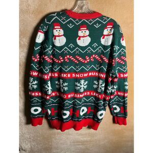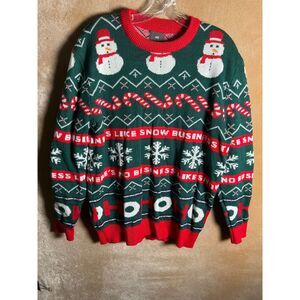 Keywords: Christmas sweater, holiday knitwear, snowman print, festive apparel, winter clothing, party sweater, ugly sweater, casual knit, gift idea, seasonal fashion, cozy, long sleeve, red green