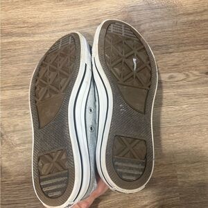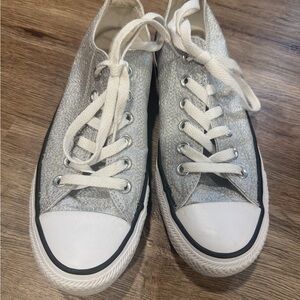 Chic Converse low-tops in metallic silver. Features lace-up style and iconic look.