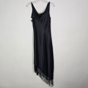 The Vintage Y2K A.B.S.by Allen Schwartz Sleek Sleeveless Slip Black Gown in size 8 is a stunning and elegant dress perfect for formal occasions like weddings. Made from luxurious silky rayon blend with intricate floral embroidery, beading, and fringe accents, this midi-length gown features a cowl neck and zip closure for a sleek and sophisticated look. The dress is designed with a sexy and classic theme in mind, making it a versatile piece that can be worn in any season. Made in the United States by the renowned brand ABS by Allen Schwartz, this dress is a timeless and stylish addition to any woman's wardrobe.