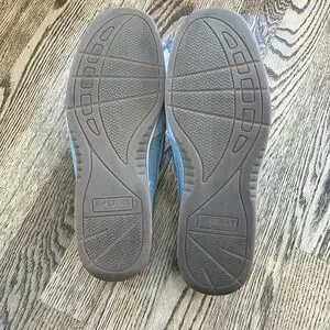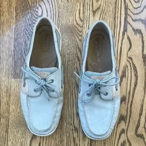 Sperry Women's, Bluefish 2 Eye Boat Shoe Grey Chambray. Size 9. With sparkle accents. Classic Sperry boat shoes in light gray. Ideal for casual wear. Durable and stylish.