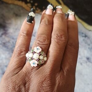 Gorgeous Jardin Collection Simmering Freshwater Pearl, Rhodolite Garnet, Amethyst, & Neon Apatite enameled ring in Platinum Over Sterling Silver. Each ring has hand carved mother of pearl flowers and each piece is made individually by hand. This ring is also adorned with beautiful colored Neon Apatite and Amethyst jems. Then to top it off Each leaf has beautiful green enameling. The ring is finished in platinum over sterling silver which makes it durable and tarnish resistant. Jardin means flowers and these pieces have no shortage of them. Give flowers that last!