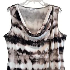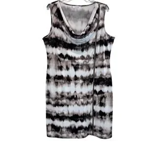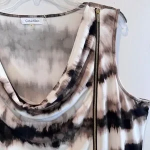 Calvin Klein Women's Dress Brown White Workwear Office Business Preppy Size XL, Calvin Klein dress, sleeveless dress, cowl neck dress, bodycon dress, tie dye dress, abstract print dress, black white dress, womens dress, size XL dress, casual dress, party dress, cocktail dress, midi dress