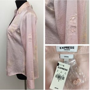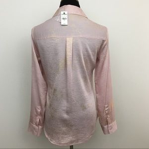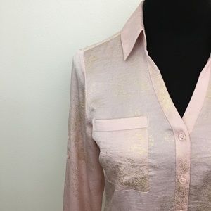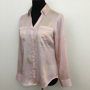 Light weight v-neck button down blouse has two front pockets & long sleeves with single button cuffs. Blush pink color with a splash of gold. Sleeves can be worn long or rolled up with a buttoned strap. Measurements flat are approximately 18.5” pit to pit & 25” long. Content is 100% Polyester. In excellent new condition with NO spots or damage. NWT
