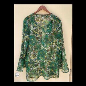 This stunning 70's-inspired beach cover-up by True Religion is the perfect blend of vintage charm and modern boho chic. Featuring a flowy fit with a vibrant green abstract paisley print, it’s adorned with playful lampwork glass bead accents along the neckline for a touch of unique artistry.