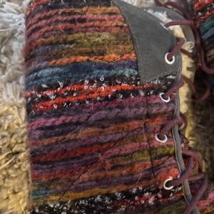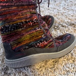 Merrell mid-calf winter boots combine cozy style with outdoor performance. These boots feature a vibrant multi-color striped knit upper with durable grey suede overlays at the toe, heel, and lace panels. The interior is fully lined with plush white faux fur for warmth and comfort during cold weather. Designed with a secure lace-up closure and a textured rubber outsole for reliable traction on various surfaces, these boots are perfect for winter walks or après-ski lounging.
