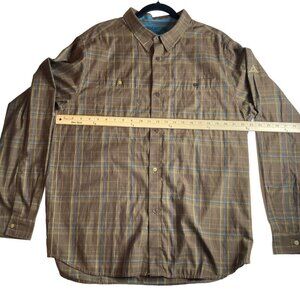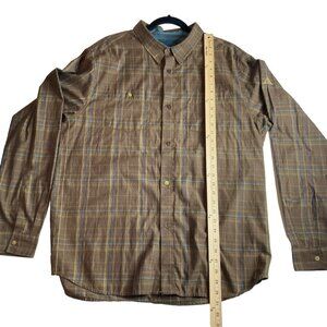 Prana Brown Blue Plaid Western Style Shirt Mens XL Chest Pockets Cotton Blend