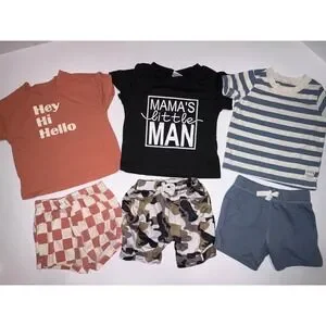Keywords: baby boy clothes, 6-9 months, boys outfit bundle, graphic tees, onesies, shorts, baby boy tops, baby boy bottoms, kids clothing lot, childrens wear, play clothes, everyday outfits, summer baby clothes, casual baby wear, mixed brand baby 1.14