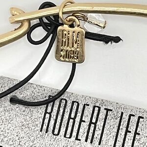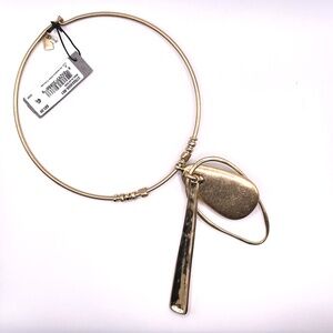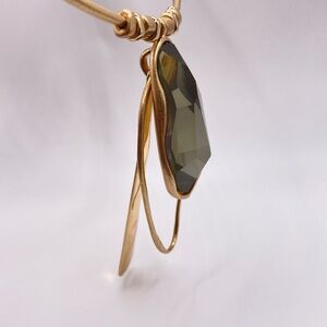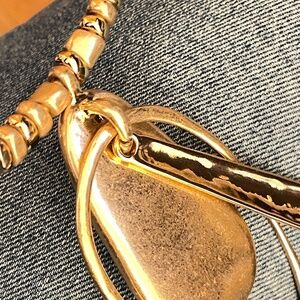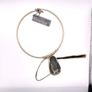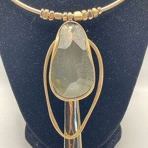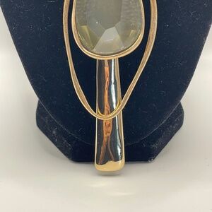 RLM SoHo Robert Lee Morris NWT gold plated choker necklace with three large organic shape pendants -- one being a large faceted smoky color stone. The back 2 are attached to the back of the stone (see photo). This is pre-owned but still has tags attached. Please ask if you have questions. This is definitely a statement eye catching necklace. Bold & artsy.
